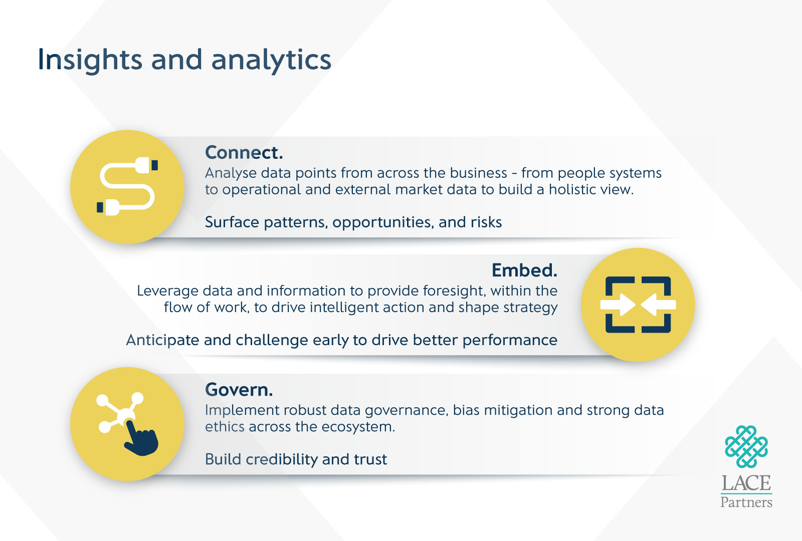 All four of these components; your new service delivery model, connected digital architecture, embedded analytics and intelligent planning are critical to power the Intelligence and insights engine. Executed correctly, it will shift the way HR delivers services to the business: